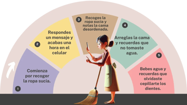 Cuando empezaba a recoger la ropa sucia, me distraía con el móvil, y entonces me daba cuenta de que la cama estaba deshecha. Iba a arreglarla, recordaba que pasaba el camión de la basura, salía corriendo a sacar la bolsa y, al volver, ya no recordaba por dónde había empezado. Así, comenzaba otra tarea.